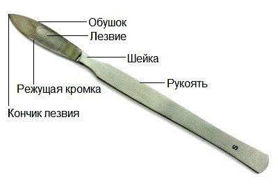 На лезвии скальпеля выделяют 3 основные составляющие – режущую кромку, кончик, обушок. Режущей кромкой, соответственно, выполняется рез. Чаще всего, режущая кромка присутствует только на одной стороне лезвия, но встречаются и обоюдоострые лезвия. Острие скальпеля частично имеет заточку. Обушок используется в качестве дополнительного упора для пальцев, когда возникает необходимость сильного и контролируемого нажатия на скальпель во время работы. В основном лезвия делают из нержавеющей (менее острые, но не окисляющиеся на воздухе лезвия) и высокоуглеродистой (острее лезвий из нержавеющей стали, быстро окисляются на воздухе) стали.