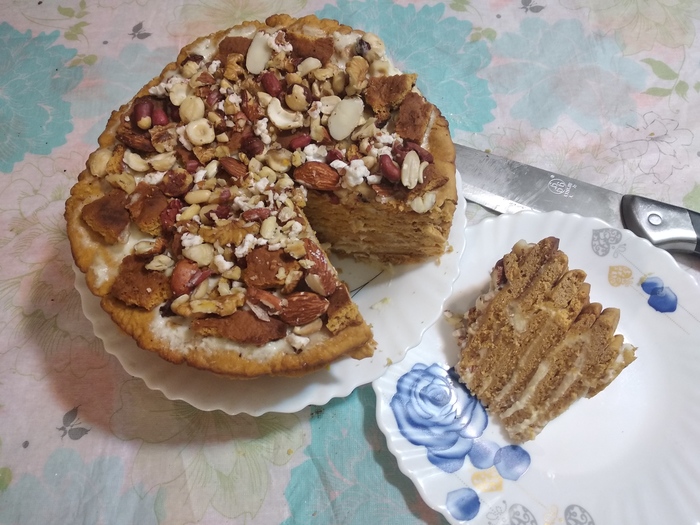 После, между каждым из коржей как следует промазываем крем, где-то по 1-2 столовой ложки, и так пока не останется один последний коржик. Он пойдет на украшение верней части, так что можно взять самый горелый или треснувший. Последний коржик разламываем на части, и посыпаем верх торта, а еще можно добавить туда орехи, с ними будет только вкуснее!
