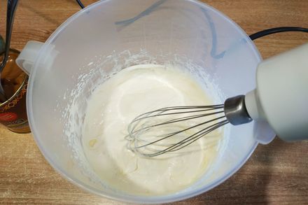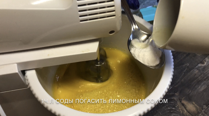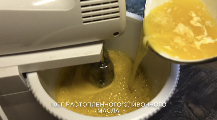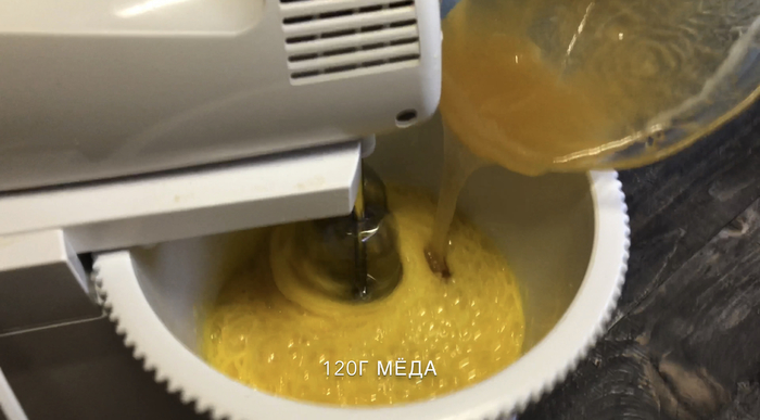 Во взбитые яйца начинаем постепенно по 1 ст.л. добавлять медовую смесь и перемешиваем и так пока не введете всю медовую смесь.