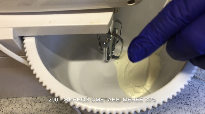 Для крема берем сметану, добавляем сахарную пудру и вареное сгущенное молоко и все хорошо перемешиваем миксером до однородной, пышной консистенции.