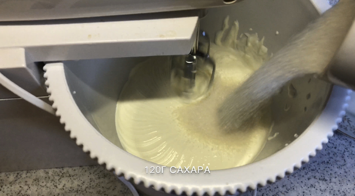 Тем временем берем яйца и взбиваем их в течении 5 минут до пышной, воздушной, белой массы.
