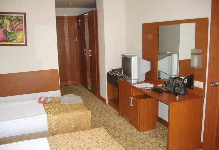Номер. Обычный стандартный номер: двуспальная кровать, односпальная, кресло, ТВ, стол, тумбочки, шкаф, сейф, балкон. Удобная ванная с феном.