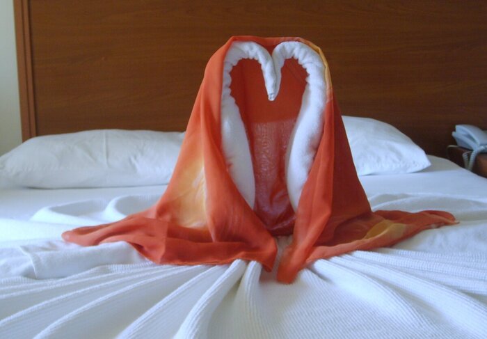 «мы не переживали- не нам же убирать»- напомнила о себе туристка с опытом. Не стали заморачиваться и мы. А вот горничной на третий день надоело махать тряпкой и она вызвала сантехника, который помахал ключом и лужи исчезли. На радостях она нам каждый день лепила сердечки и лебедей из полотенец , а может потому что мы ей оставляли денюжку.