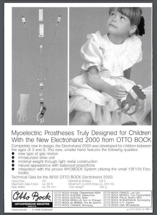 И, наконец, детские Протез хорошо зарекомендовал себя в использовании детьми, поэтому за 30 лет он почти не изменился:. Такие давно существуют. Ниже - реклама Electrohand 2000 от Оттобока в журнале 1989 года. Протез хорошо зарекомендовал себя в использовании детьми, поэтому за 30 лет он почти не изменился: