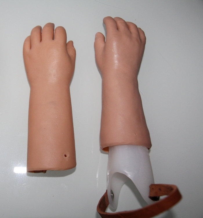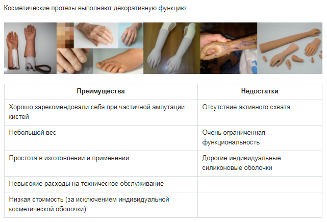 Косметические протезы — это подобие руки из телесного силикона или ПВХ. Хват такой рукой не сделать, но тяжесть, хоть и небольшая, создаёт нагрузку на мышцы, а ребёнок привыкает к правильным движениям рукой. Косметические протезы включают также в ИПРА детей старшего возраста. Функционала у такой руки нет, а неподвижная рука манекена выглядит довольно подозрительно, поэтому обычно протез не надевают.