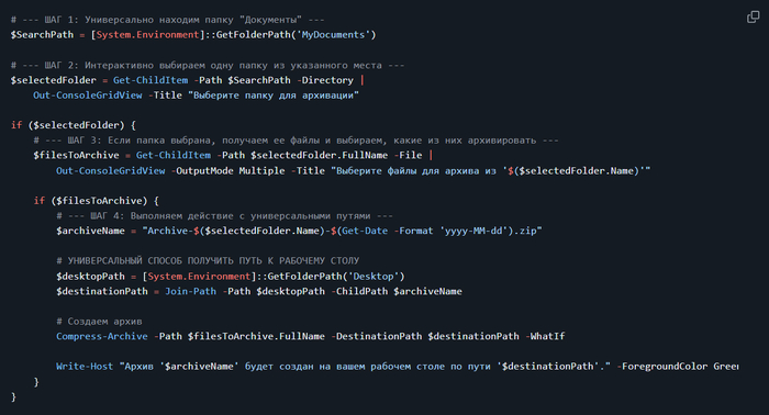 Это превращает сложную многошаговую задачу (найти папку, найти в ней файлы, скопировать их пути, запустить команду архивации) в интуитивно понятный интерактивный процесс из двух шагов.