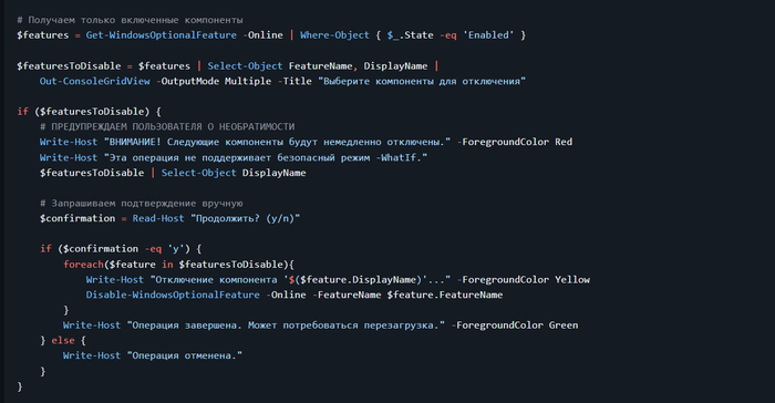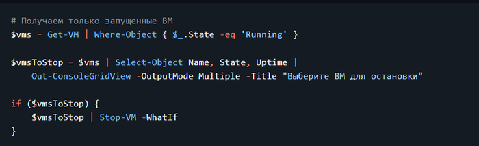 > # Если что-то было выбрано, передаем объекты на остановку > if ($procsToStop) { $procsToStop | Stop-Process -WhatIf }