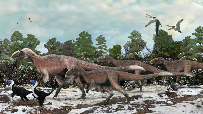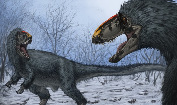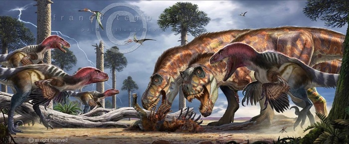 9-ти метровый хищник с рогами, и маленькими передними лапками. На картинке изображены передние лапы струтиомима, тираннозавра и карнотавра.