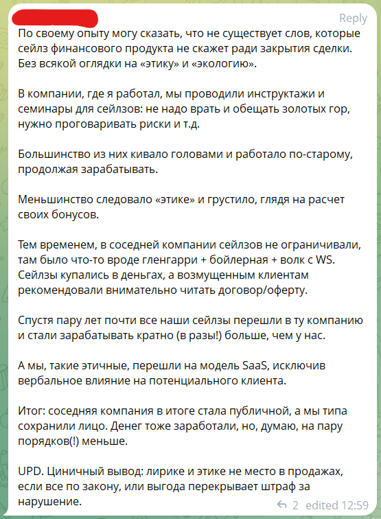 На следующий день меня встретили у ресепшн, вручили пачку распечатанных листов (условия работы + анкета, которую обычно заполняют на собеседованиях) со словами, что бумаги можно заполнить в любое время, в том числе и в конце рабочего дня. Условия, конечно, просто шикарные: полностью чёрная зп, оклад 40 тыс., но, если ты вдруг не выполнил план по звонкам/встречам, то этот день не оплачивается. При обещанном графике 5/2 зачем-то было указано расписание работы в субботу - опять же, для нерасторопных, не выполнивших план, предоставлялась уникальная возможность поработать в выходные. А, ну и штраф за каждый чих, куда без этого.