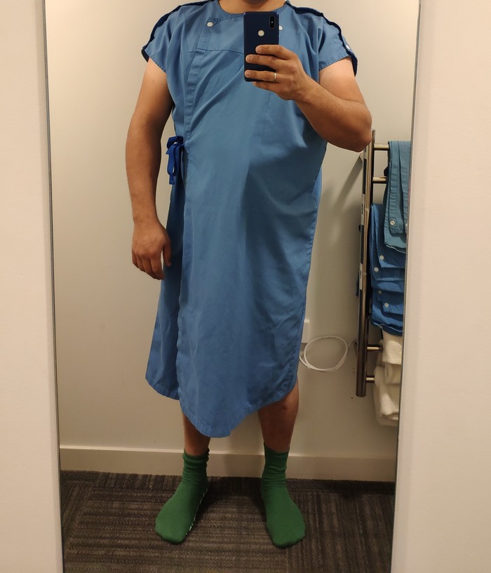 Так как жена в назначеное время забирала младшую дочь из садика, меня в хирургический центр отвёзла жена моего босса (очень заботливый, очень им благодарен). На ресепшене со второй попытки нашли папку с моими документами (обычное российское имя для них криво звучит) и в сопровождении медсестры я пошел переодеваться в больничное.