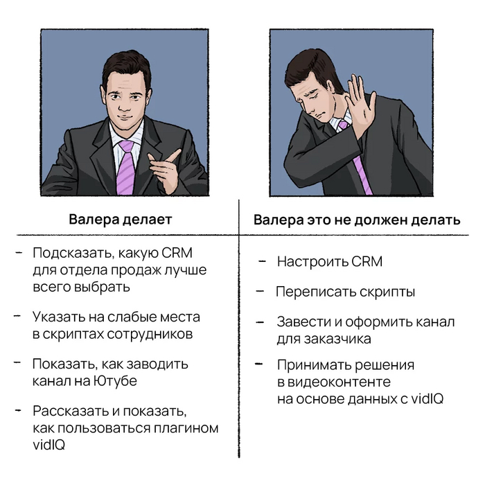 Ставим сразу засечку: ментор не является волшебной таблеткой. Его функционал ограничен своей же ролью. Напомним, что Валера менторит Аркадия по построению отдела продаж, а Кристина — по созданию канала на Ютубе.