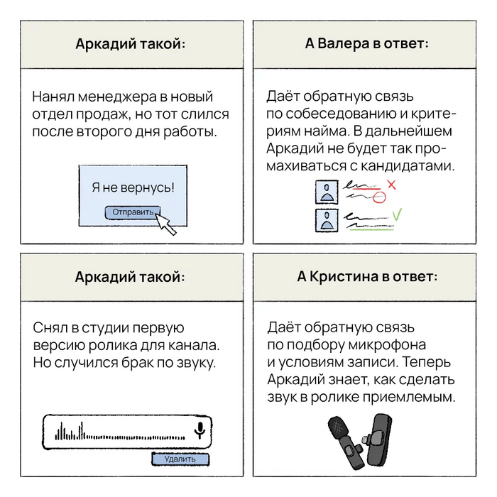 Но он не должен говорить: «Делай вот так два раза в день — и спина болеть не будет». Сначала действие совершает Аркадий, получает какой-то результат, и только потом в игру вступает ментор. Это значит, что Аркадий всё равно набьёт шишек, наберётся опыта и не получит никакого готового шаблона.