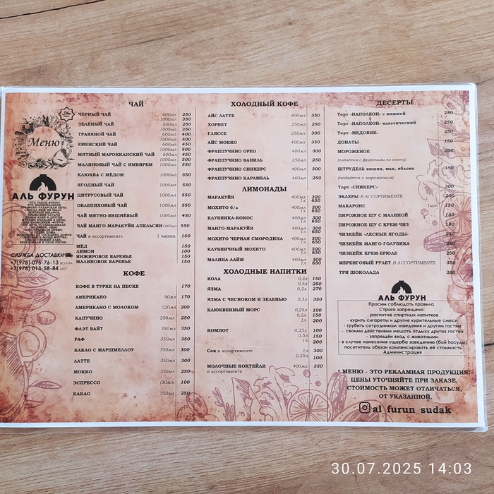 Летний отдых. Судак. Кафе. Кормят , кстати, прилично. Внимание, мелкий шрифт в конце меню :))