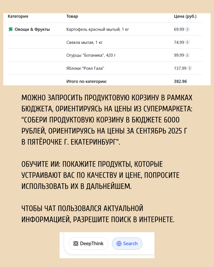 Обязательно разрешите чату поиск в интернете, чтобы он мог ориентироваться на текущие данные по питанию и цены.