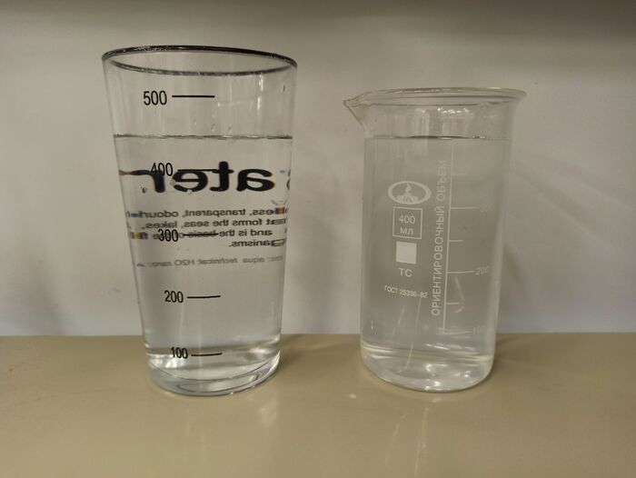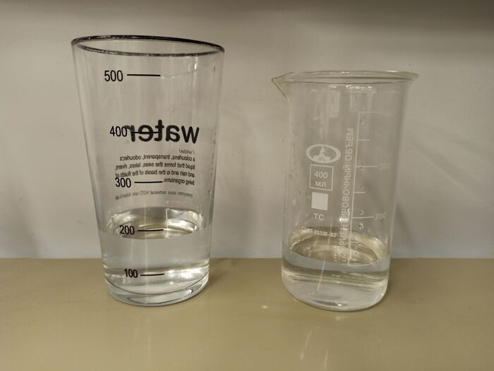 Однако не столь удивительна своей бесполезностью эта информация, сколь бессмысленно предназначение самого стакана. Казалось бы, что сложного в простой разметке объема, однако дизайнерская шкала не знает пощады, когда набираешь идентичный объем жидкости в лабораторный стакан (100 и 400 мл соотв.)