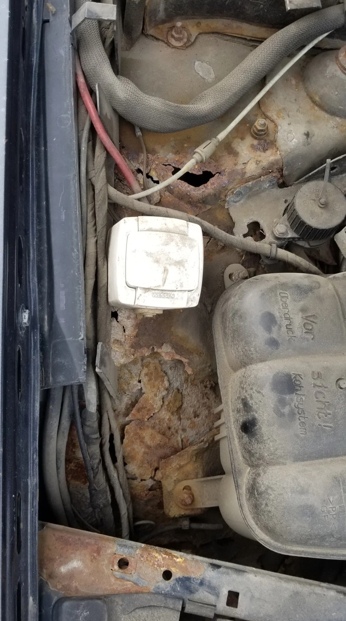 Множественные очаги коррозии, не хватает части капота и задних арок)