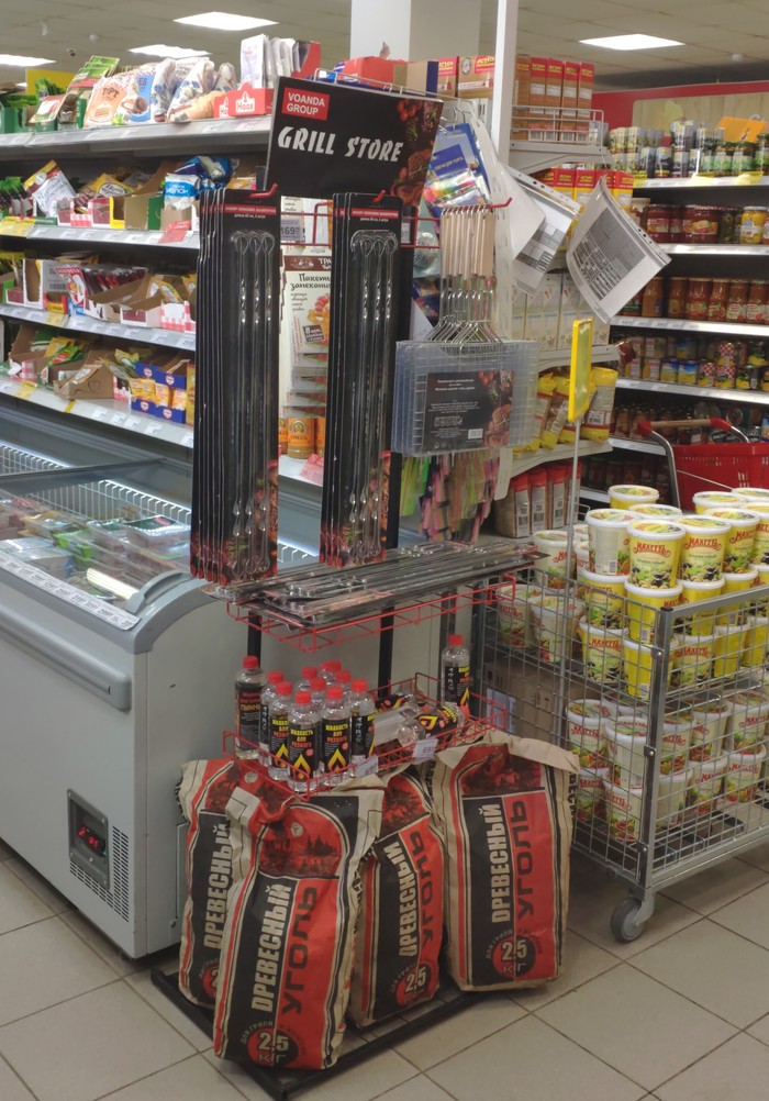 Напротив угла с грунтом - ближе к центру магазина между полуфабрикатами и бакалеей также пристроили жидкость для розжига, шампуры и угли..