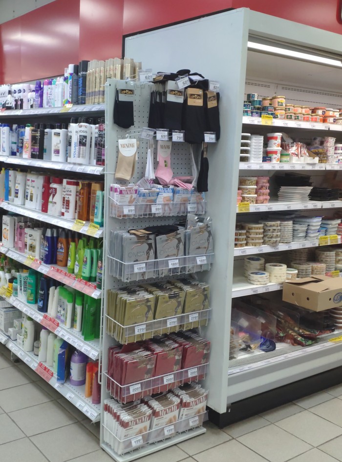 С другой стороны основной "очаг" бытовой химии заканчивается шампунями. И, видимо чтобы шибко не контрастировать с холодильником морепродуктов туда впихнули стенд с колготками.