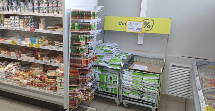 В другом углу магазина - средь продуктов питания между заморозкой и кондитеркой уютно, не смущаясь, пристроились семена и грунт.. Ну а почему бы и нет!? - сезон)))