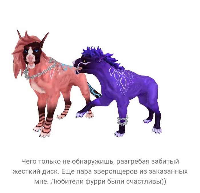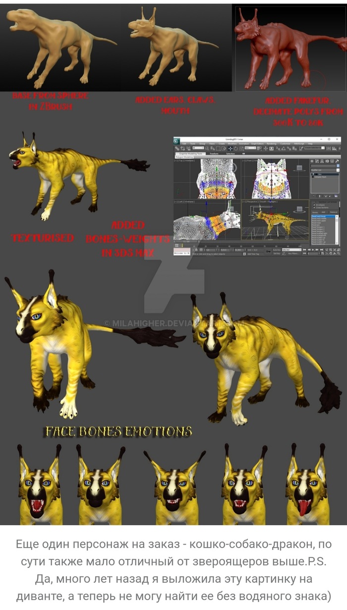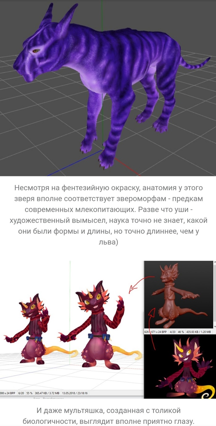 На рендере выше плохо видно влажный блеск глаз, который придает живости при работе с самим животным и его движениями. Мимикой я прямо горжусь. Пожалуй, только лень и абсолютное отсутствие талантов к кодингу остановили меня от того, чтобы сделать с подобными монстриками свою игрушку. Хотя, быть может, однажды будет сделана игра — симулятор раннего Кайнозоя, где вместо привычных по старым фильмам-реконструкциям серо-бурых окрасок животные будут иметь кислотно-фантастическую окраску))
