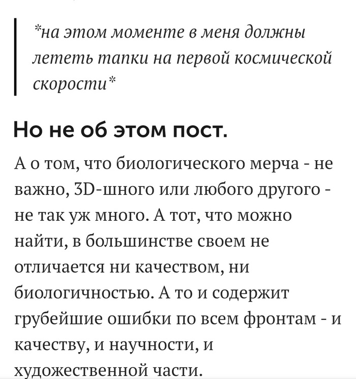 Другая проблема - из-за некоторой закостенелости (что поделать - профессиональная деформация) мне бывает сложно смотреть на чужие творения. Причем как с художественной, так и с биологической точки зрения. Особенно, когда человек оправдывает все косяки с анатомией и качеством "своим стилем". Ты рисуешь без году неделя, какой стиль?!