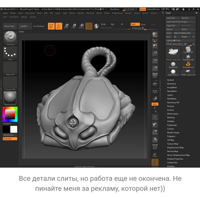 Но и это еще не все. Объединенную модель еще надо проверить на ошибки - дыры, пересечения, визуальные отклонения и т.д. Отчасти это делается в самой программе для лепки, отчасти в других, специализированных программах. Кроме того, я люблю орудовать рендерами.