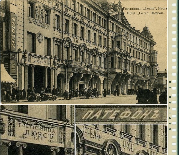 Обратите на написание слова гостинница, с двойным «Н», по правилам того времени, хотя в словаре Даля, издания 1880 года, в этом слове используется уже одно «н». И еще интересный момент: на фасаде одновременно со словом «гостинница» используется слово «отель».