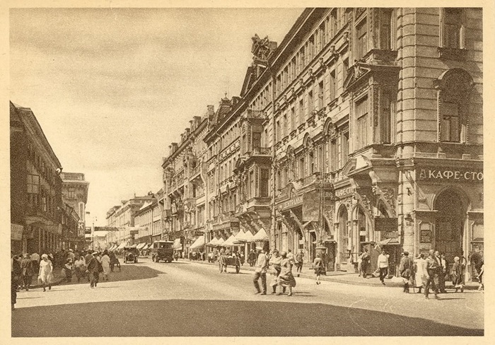 Часто пишут, что кофейня из Кафе-Столовой превращается в ресторан Астория во времена НЭПа (1921-1929). Но вот на фотографии 1928 года хорошо видна вывеска Кафе-Столовая. Допускаю, что некоторое время они функционировали параллельно. Но даже на фотографии 1933 года (см. предыдущее фото) нет вывески Астория.
