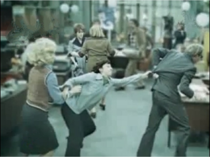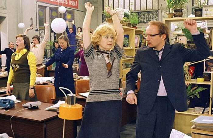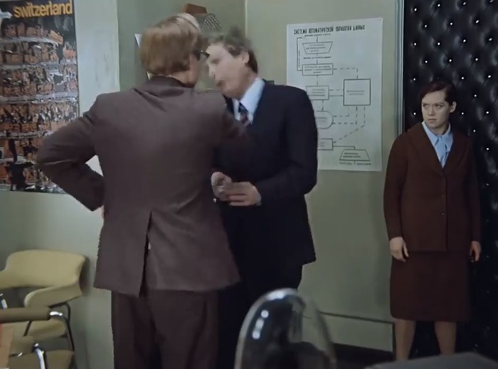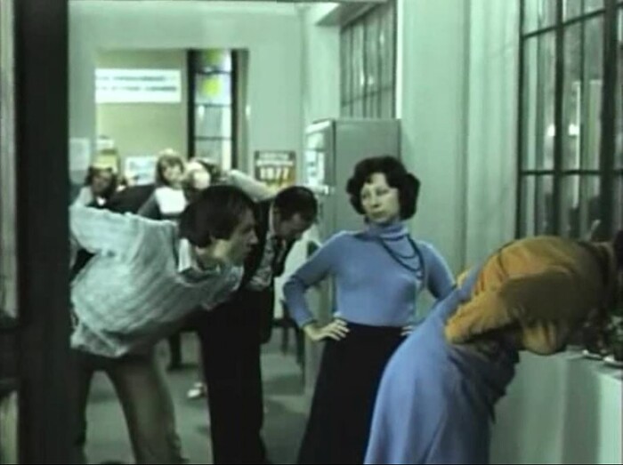 Калугина - строгий руководитель, «знающий свое дело», но при этом подчиненные как-то вяло реагируют на ее указания. Секретарша меряет сапоги, но после замечания, что это не стоило бы делать в рабочее время, так же беззаботно продолжает любоваться обновкой. Новосельцев, получив замечание о том, что неплохо было бы поработать, так же продолжает сидеть за рулем машины Самохвалова. Её требования безоговорочно выполняет только персональный водитель, но он вообще, по-моему выполняет, любые требования, даже когда направление движения задал Новосельцев: