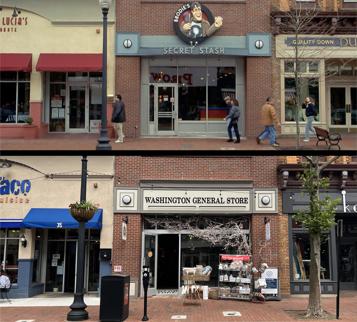 На самом деле, эти места мало изменились. Территория перед магазином изменилась больше всего. Кроме того, здание магазина оказалось намного длиннее, чем создаётся впечатление по фильму. Сейчас там висят несколько постеров, пародирующих современное кино.