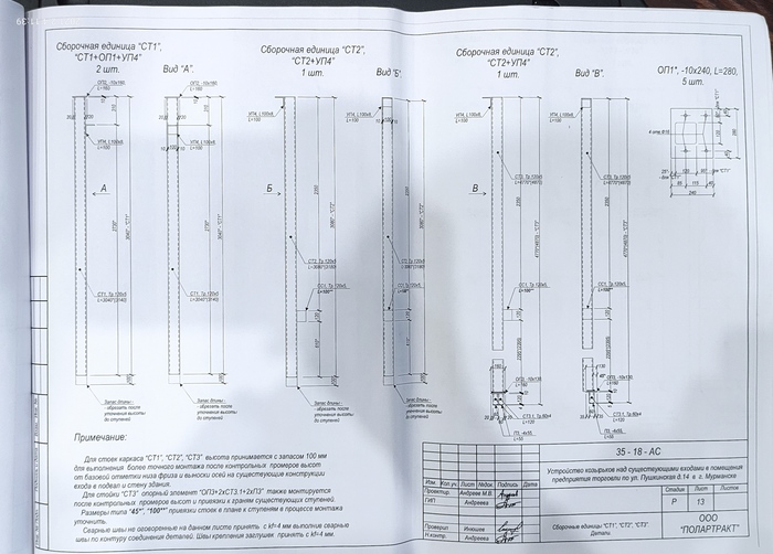 Итак. Согласно договору аренды нам предоставляли арендные каникулы, т.к. в счет платы мы должны были произвести косметический ремонт помещения и входной группы. А так же за свой счет установить козырек/навес над входом согласно проекту. Вот с этим козырьком и возникла проблема. Точнее с проектом. Проект составлялся в 2018 году, инженером, который уже никак не сможет дать комментарии по нашим вопросам. Поэтому всех кто умеет читать чертежи просим помочь разобраться корректно ли составлен проект. Фотографии проекта и входа в помещение прикрепляю. На чертежах наше крыльцо "фрагмент фасада входа в подвал №2." Так же прошу @moderator, помочь с тегами, которые помогут показать пост инженерам и архитекторам.