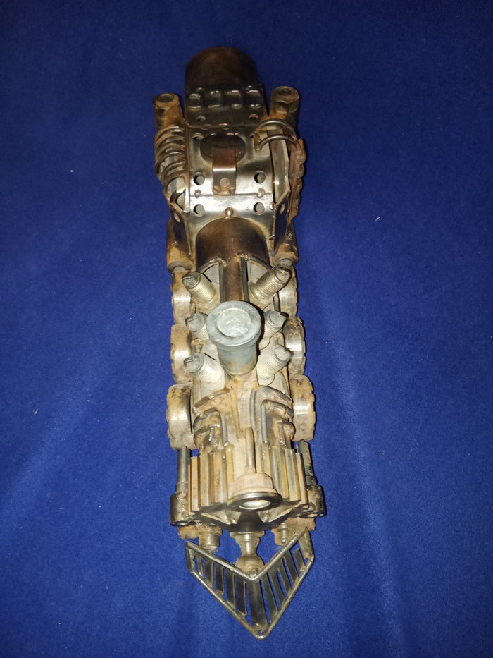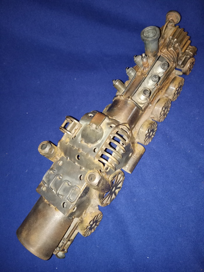 Времени потрачено - чистыми часов 12 по кусочкам , делалось опять-таки все спонтанно , сначала был кусок тонкостенной трубы и автомобильные свечи зажигания , потом все к ним пристегивалось по мере нахождения железок. В процессе пару раз переделывалось по мере просветления и появления новых идей.)