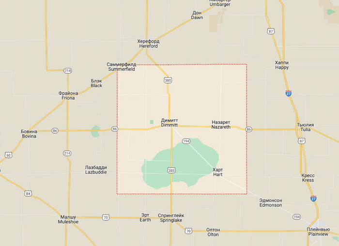 Произошло всё это в округе Кастро, штат США. По иронии судьбы этот округ имеет форму правильного квадрата со сторонами в 48 км
