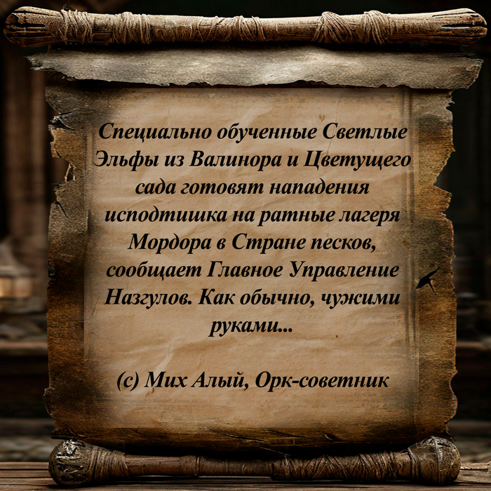 Конный разъезд местной стражи Тёмной Гвардии капитан заметил сильно раньше, чем первый горе-стражник из Валинора успел издать доблестный боевой писк от пропущенного крепкого дружеского горло- и рукопожатия Орка.