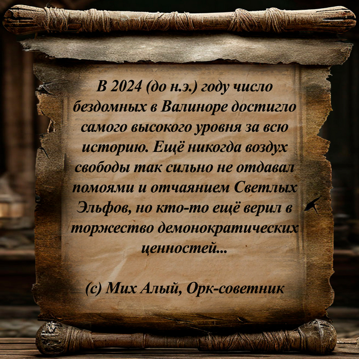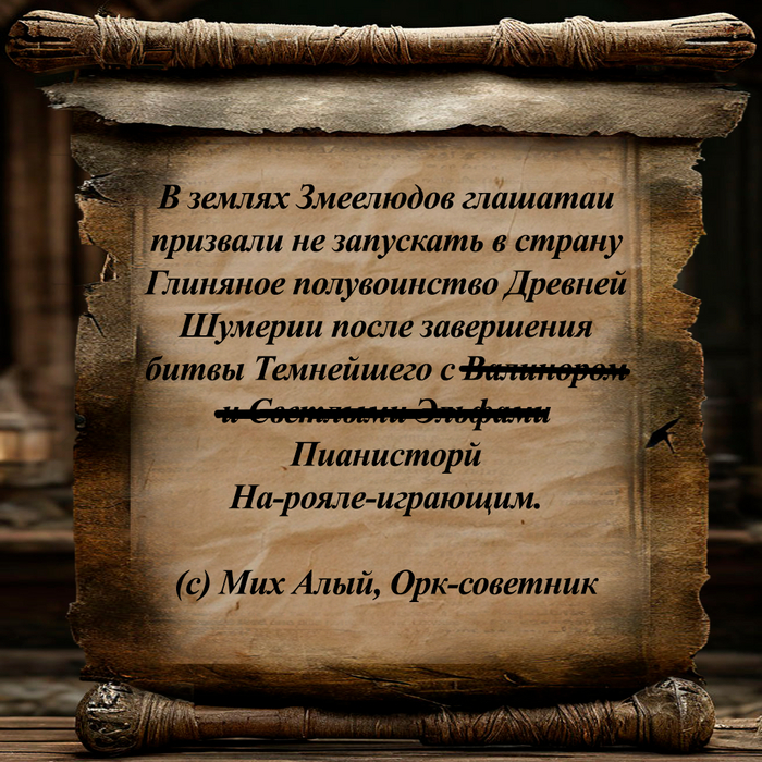 - Да мы сами в ужасе с Эльфов, - сокрушённо покачал головой и развёл руками валинорец. - Исторически-то эти земли наши были, а потом дикие орды немытых варваров из Цветущего сада, что за Большой Водой, приплыли на своих кораблях, принеся с собой разное нехорошее.