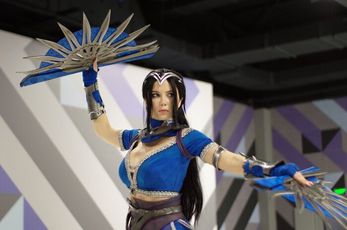 Китана из Mortal Kombat в исполнении Оити (ака Вера Андреева). Она нигде не участвовала, сидела на втором этаже на аллее авторов, подписывала и продавала свои фоточки и плакатики. Ну и фотографировалась со всеми желающими.