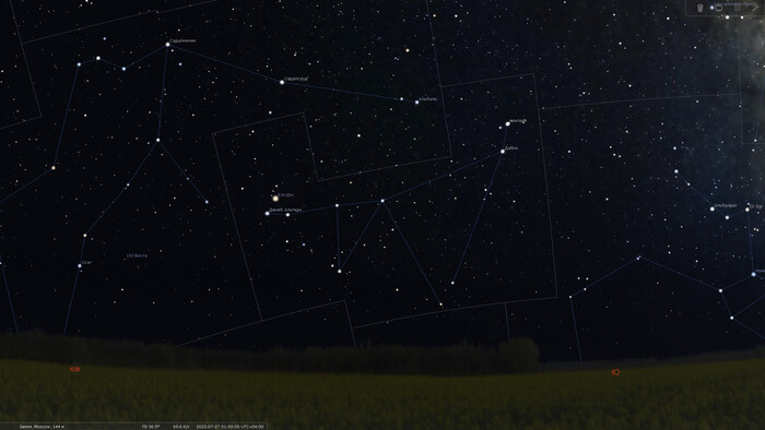 Через час после захода Солнца в южном направлении можно успеть увидеть северную часть Скорпиона (звезду Антарес и астеризм “Клещи Скорпиона”) и созвездие Стрельца. Над Стрельцом и Скорпионом возвышается огромный, но лишенный ярких звезд Змееносец.