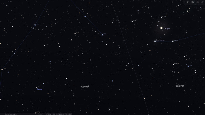 Несколько восточнее и южнее Сатурна — в соседнем созвездии Водолея — можно попытаться отыскать малую планету Веста — это крупнейший и ярчайший астероид главного пояса. В благоприятные периоды видимости Веста видна невооруженным глазом, как звезда 5 или 6 звездной величины. Сейчас как раз такой период — Веста имеет блеск 6m, и может быть без труда обнаружена в бинокль или подзорную трубу.