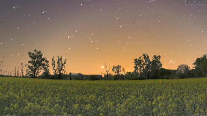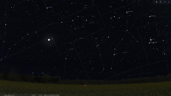 За час до восхода Солнца на северо-востоке взойдет Венера — самое яркое светило земного неба после Солнца и Луны. Венера — ближайшая к Земле планета, но сейчас находится по ту сторону Солнца, и с течением времени прячется за него, из-за чего продолжительность утренней видимости этой планеты вскоре начнет сокращаться, но сейчас она является прекрасным украшением летнего рассвета.
