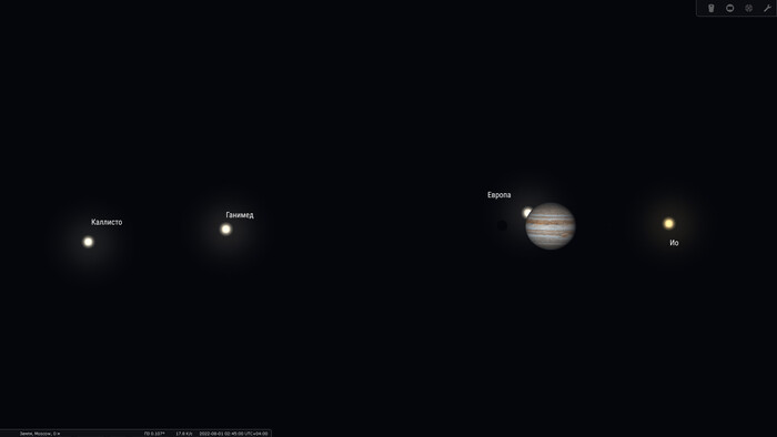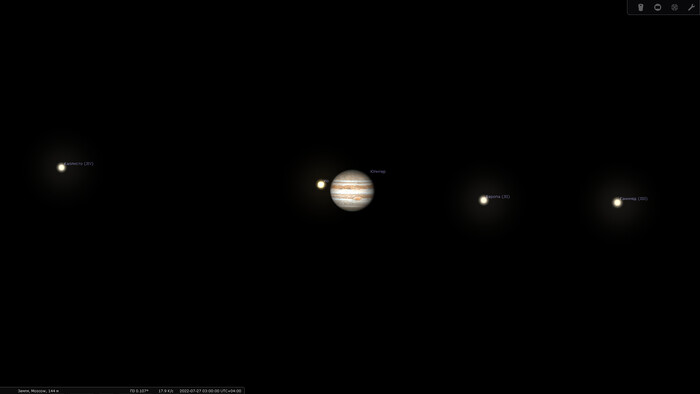 Положение спутников Юпитера меняется от ночи к ночи, и иногда даже за час наблюдений можно заметить как они перемещаются, скрываются за планетой, проходят перед её диском.