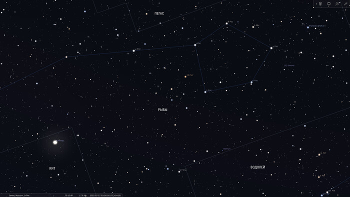 Для большинства людей, ни Кит, ни Рыбы не отличаются понятными и легко узнаваемыми очертаниями. Хотя, для любителей астрономии фигуры этих созвездий хорошо знакомы. Для тех, кто только начал знакомиться с тайнами звездных узоров, сообщу, что сейчас Юпитер расположен прямо под “Квадратом Пегаса” — огромным небесным четырехугольником, немного покосившимся, и одной своей вершиной (нижней) указывающим на Юпитер.