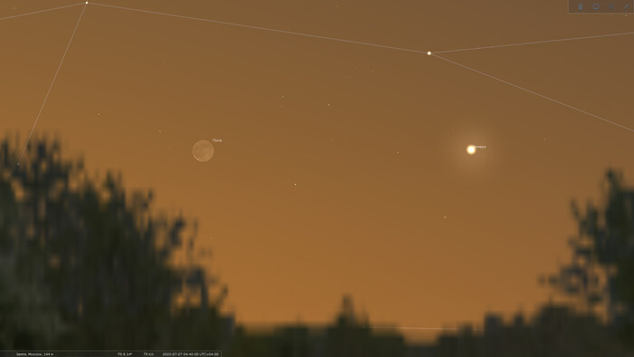 Луна еще прошлым утром была вблизи Венеры, но тогда располагалась значительно выше (севернее) и правее (западнее). Пройдя 12 градусов за сутки, Луна теперь окажется по другую сторону от Венеры. Фаза Луны еще уменьшится, хотя и до того была очень небольшой — освещенная и видимая с Земли часть Луны составит порядка 2%.