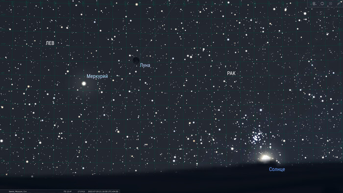 Предстоящим вечером Меркурий располагается в созвездии Рака — в одном созвездии с Солнцем. Это первая причина сложности его обнаружения. Вторая причина кроется в том, что склонение Меркурия ниже склонения Солнца, что не позволяет ему оставаться над горизонтом даже небольшое время в течение вечерних сумерек.