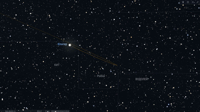 Юпитер находится в созвездии Кита — вблизи его границы с созвездием Рыб. Куда бы он не двинулся с этого места, он в любом случае попадет в созвездие Рыб. В конце ноября Юпитер вновь замрет — размаха петли которую он до этого описывал, немного не хватит, чтобы оказаться в созвездии Водолея, и с началом календарной зимы величайшая из планет вновь устремится по звёздной карте вперед.