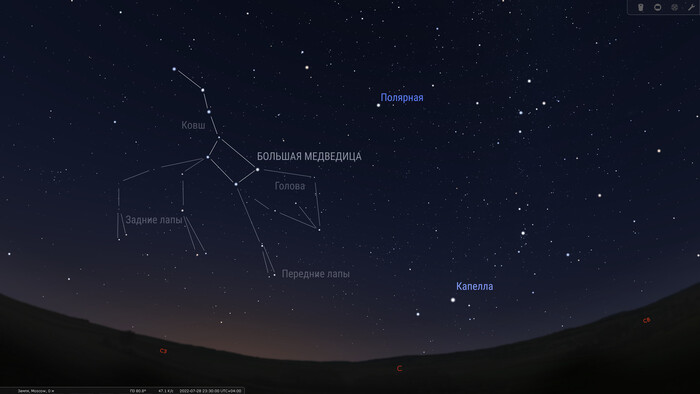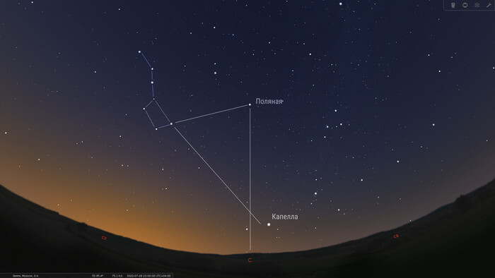 Кстати, летними вечерами на точку Севера неплохо ориентирует и звезда Капелла — она видна низко над горизонтом именно над северным направлением.