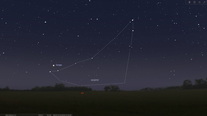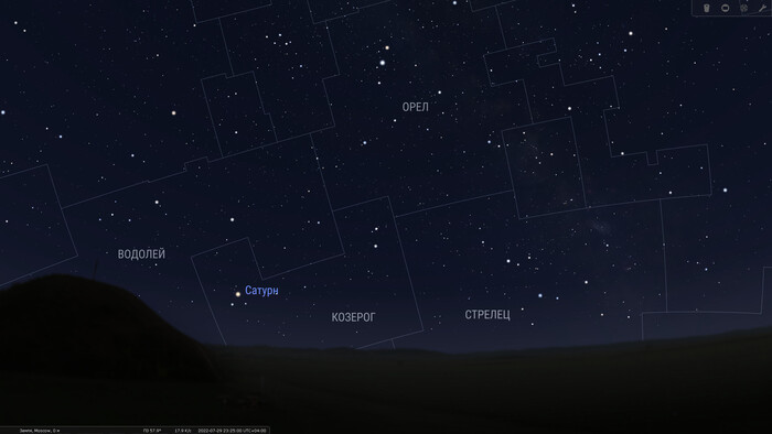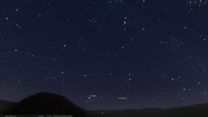 С наступлением темноты над юго-восточной частью горизонтом восходит Сатурн — самая далекая из видимых глазом планет Солнечной системы. Сатурн находится в созвездии Козерога, перемещается попятно и через две недели вступит в противостояние с Солнцем. Сейчас лучшие условия для наблюдения Сатурна.