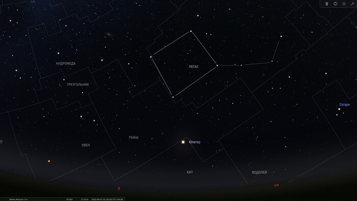 В данном случае, Юпитер просто поможет Вам найти созвездие Пегаса. Летнем небе Пегас летит как-будто бы вверх копытами. Потому, что его шея направлена вниз и на запад, а голова Пегаса оказалась ровно над Сатурном.