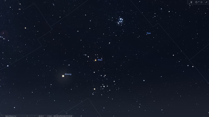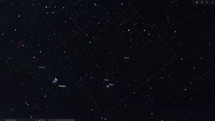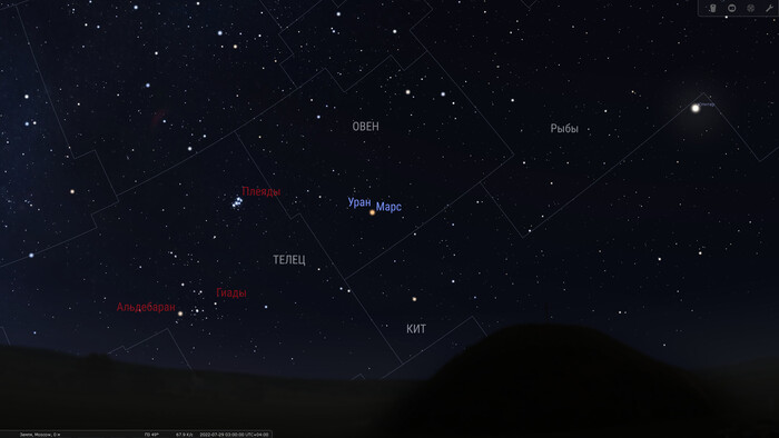 В последующие ночи Марс продолжит прямое движение (он пока не ретроградный) в сторону созвездия Тельца (куда перейдет через 10 дней) и звездного скопления Плеяды, любоваться которым Вы можете уже сейчас — после полуночи. А Уран останется в Овне еще на целый год (по меньшей мере).