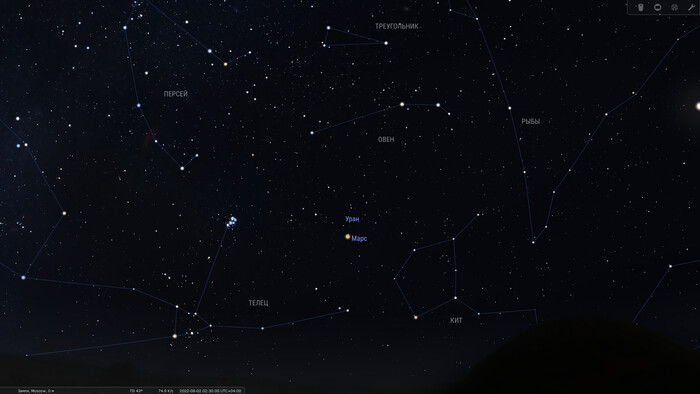 Как по расписанию, через час на востоке взойдут Марс и Уран — обе планеты в созвездии Овна, и именно в эту ночь (как и в предыдущую) Марс и Уран наиболее близки. Далее Марс начнет убегать от медленного Урана, но сейчас их разделяет на небе угловое расстояние менее чем полтора градуса.