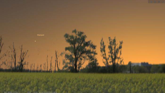 Период вечерней видимости Меркурия только начинается. Сейчас планета удалена от Солнца к востоку на 11 градусов (угловое расстояние между планетой и Солнце называется элонгацией), и эта величина растет ото дня ко дню. Вместе с ней очень быстро убывает склонение Меркурия, что не позволяет увеличиваться продолжительности вечерней видимости — такая ситуация в летне-осенний период для Меркурия в северном полушарии Земли является классической. Меркурий в конце лета и начале осени хорошо бывает виден утром, но если случается вечерняя видимость в период с июля по ноябрь, она проходит незамеченной.